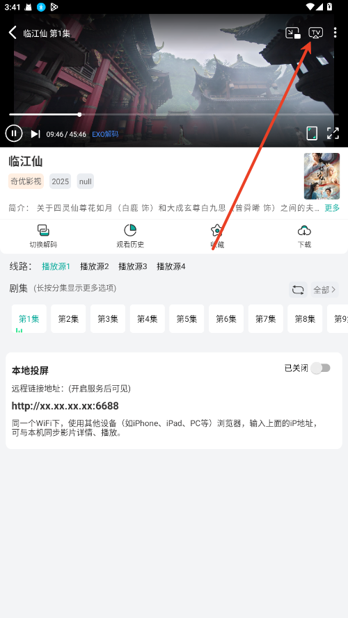 在播放界面,点击右上角的“TV投屏”按钮。