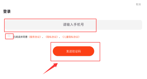 2、输入手机号并勾选协议后发送验证码,完成登录。