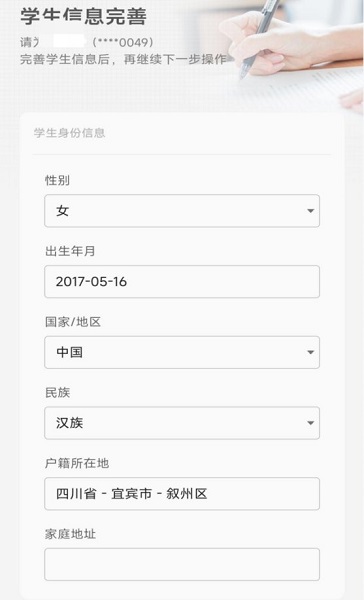 4、第三步:完善学生个人信息,填写真实的学生身份信息。如图所示。(注意:这里的家庭地址填写户籍地址:户口本首页上的地址)