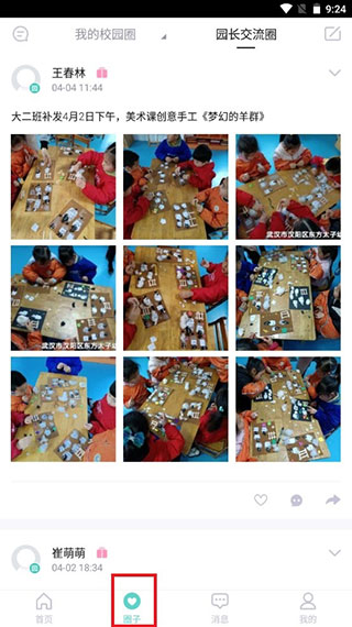 3、点击软件下方【圈子】即可查看【我的校友圈】和【园长交流圈】。