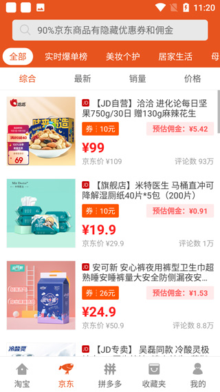 2、京东页展示居家日用等分类商品,如护手霜等,标注价格、优惠券及预估佣金,可按综合、销量、价格排序。