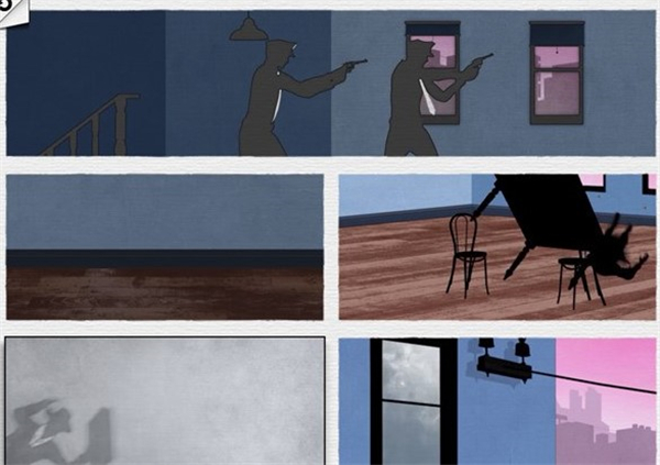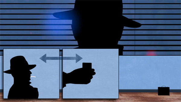 4、如下图所示调转图片位置,当警察开枪射击的时候,主人公飞身一跃,桌子侧翻在地挡住了子弹,主人公便可以趁此机会跳窗逃走。