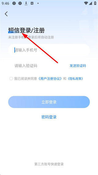 3、短信登录、注册界面,输入手机号并获取验证码,勾选同意相关协议后点击立即登录,未注册手机号登录后将自动注册,也可切换为密码登录方式。