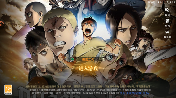 2、立体机动极致体验:3D全视角战斗还原动画中高速穿梭、精准斩击后颈的爽快感,搭配泽野弘之BGM与原版CV配音燃爆战场。