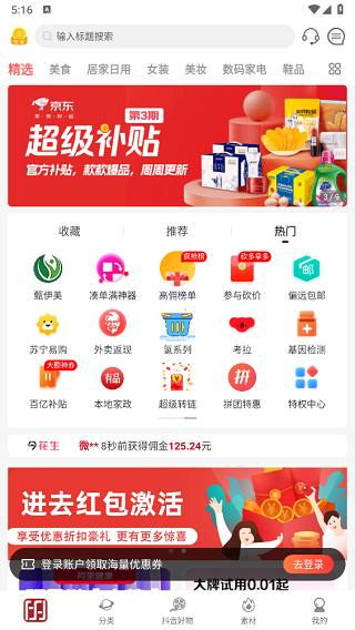 3、抖音好物:可以在这里看到抖音直播和一些达人的推荐好物,你可以自己选择省钱购买或者推荐他人购买,这两者都能让你获得一的奖励。