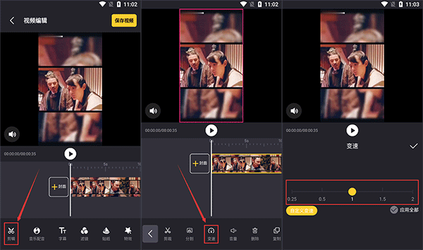4、在【剪辑】选项内选择【变速】,可以0.25倍速到2倍速自由调节。
