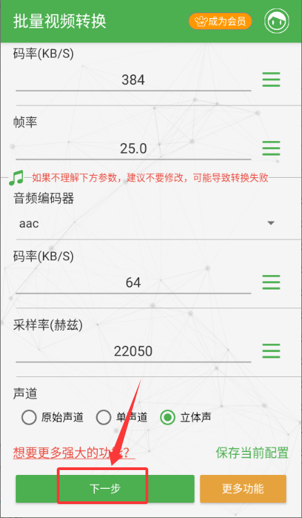 3、在转换设置页确认码率帧率等参数,点击下一步推进流程。