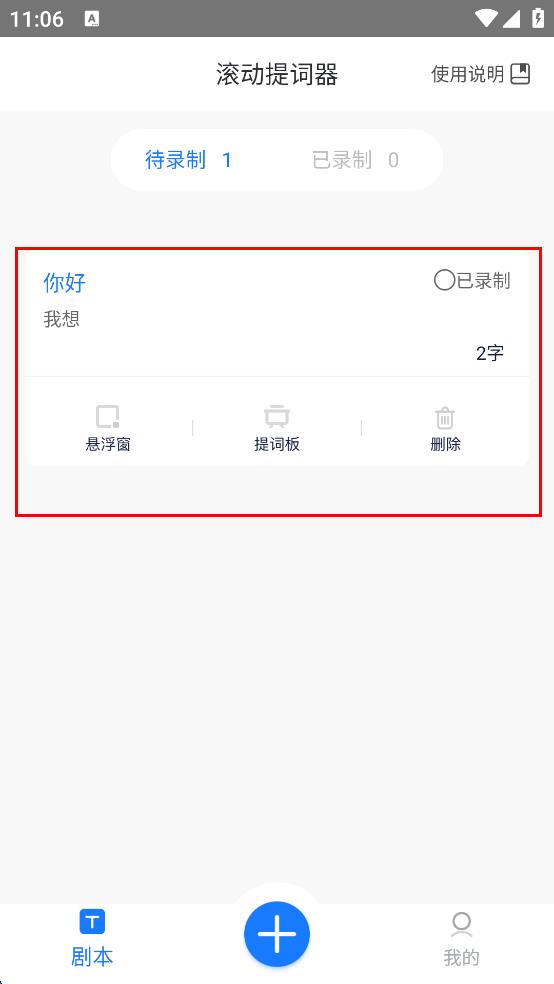 4、保存成功后,回到主界面,可看到添加的剧本,后续可根据需要使用悬浮窗、提词板功能或删除剧本。