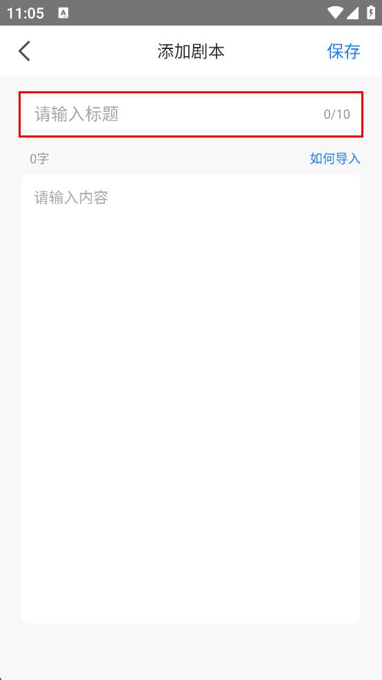 3、在添加剧本页面,先输入标题,再输入剧本内容,完成后点击保存按钮。