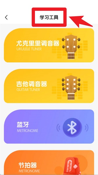 4、在学习工具界面,用户可以使用尤克里里调音器、吉他调音器、节拍器等工具,帮助孩子在练习时更加专业。