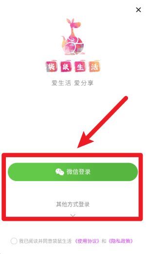 1、首次进入袋鼠生活APP后,点击绿色按钮“微信登录”即可快速授权登录账号,完成后可进入首页浏览商品。
