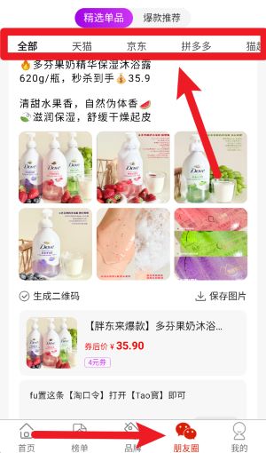 5、在“朋友圈”页面中,可浏览精选好物推荐内容,支持按平台分类筛选并查看商品券后价格及使用说明。