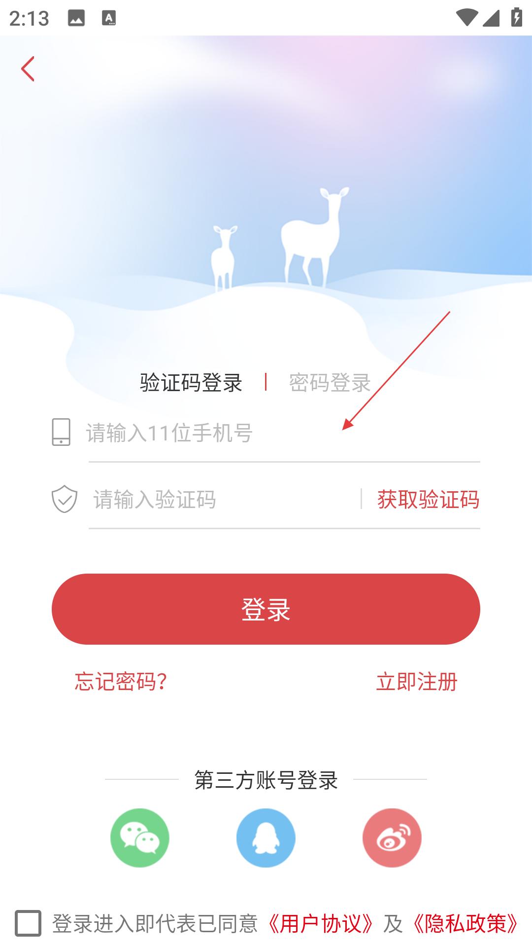 2、进入登录页,有验证码、密码登录两种方式,需填手机号、验证码,可第三方账号登录,勾选同意协议后登录。