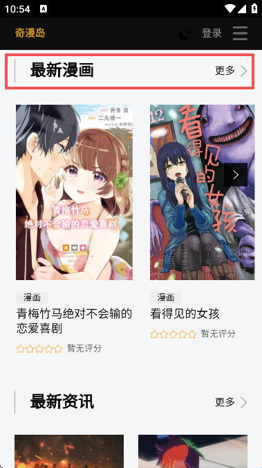 1、打开软件进入首页,先往下滑,找到红色框中的“最新漫画”。
