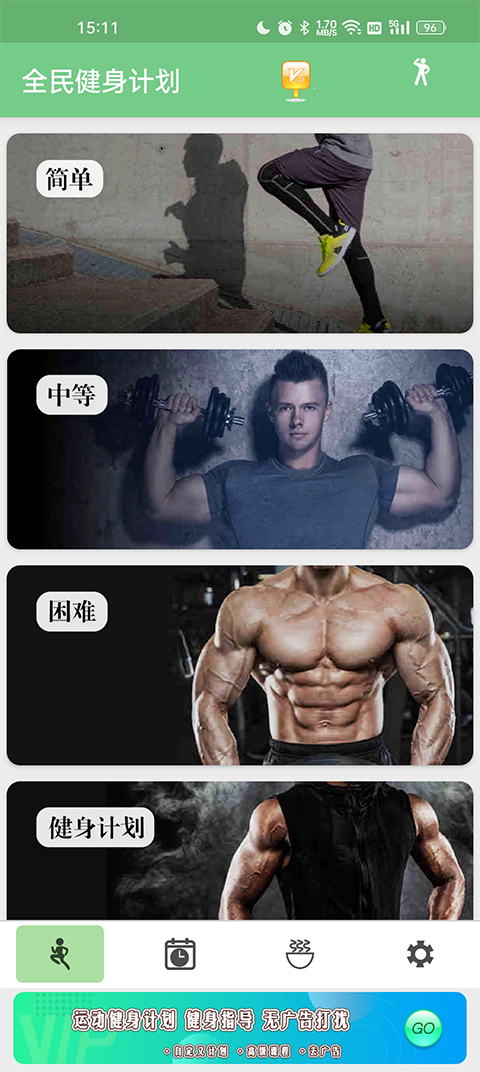 2、在首页上,首先你需要根据自己的训练基础来选择一个健身计划。建议从简单的开始。如果你觉得比较容易,你可以选择中等难度的或者比较难的,以此类推。
