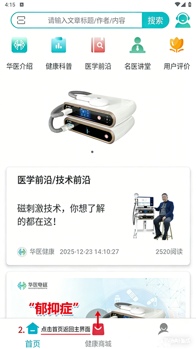 1、打开软件,进入首页界面。顶部有搜索栏可输入文章标题或内容,下方展示 “华医介绍”“健康科普” 等功能模块。