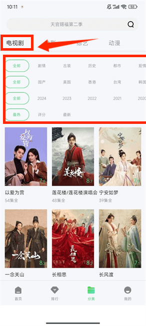 2、进入分类页面,选择电视剧。您可以按情节类型、地区、年份和流行程度执行多个过滤器。