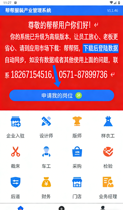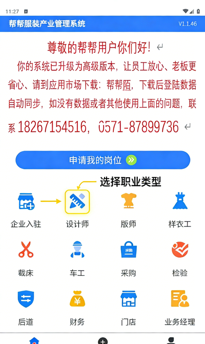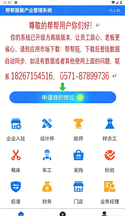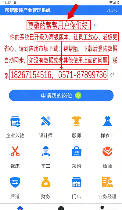 1、打开帮帮服装产业管理系统,进入首页,查看系统升级通知及联系信息。