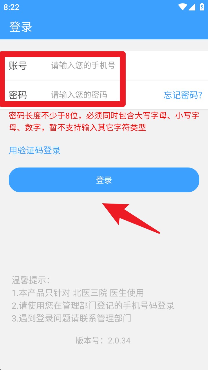 1、打开App后,进入登录界面,输入手机号和密码,点击下方的“登录”按钮,完成身份验证,进入系统。