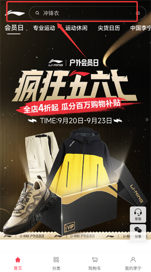 2、返回首页后,在顶部搜索栏输入冲锋衣,查找相关商品信息。