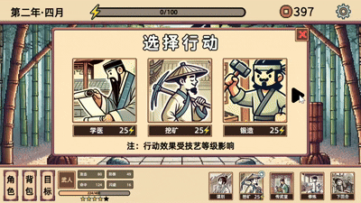 小小侠客模拟器巧妙融合Roguelike元素,每次冒险都是一次全新的征程,玩家会遭遇截然不同的场景、事件与敌人,每一次探索都充满未知与惊喜。游戏中的修炼系统也极具策略性,玩家需要合理取舍有限的资源,在提升武学境界、增强内力修为、强化装备品质等方面做出明智选择,以此来提升自身实力。而像素2D画面风格,更是为游戏增添了独特的武侠氛围,仿佛将玩家带回到那个刀光剑影、快意恩仇的古代江湖世界。