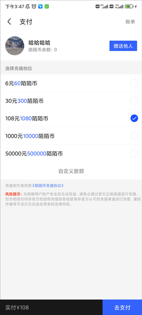 4、在陌陌币的充值下一步就可以看到一个蓝色的“赠送他人”的按钮,我们在这里就可以给别人充值赠送陌陌币。
