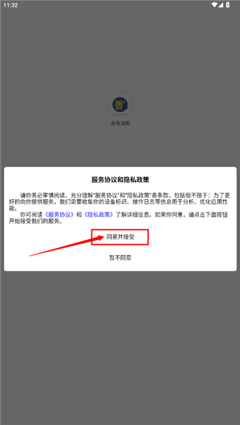1、当你完成下载与安装后,打开软件,此时会弹出【服务协议和隐私政策】,点击【同意并继续】即可。