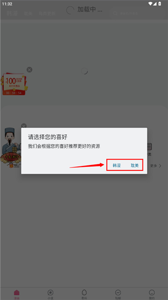 在进入首页前,下选择您的喜好,分别有:韩漫或者耽美,之后在软件内也可以更改。