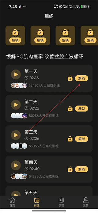 3、进入培训页面,找到第一天的培训内容,点击相应的解锁按钮,即可解锁培训项目。