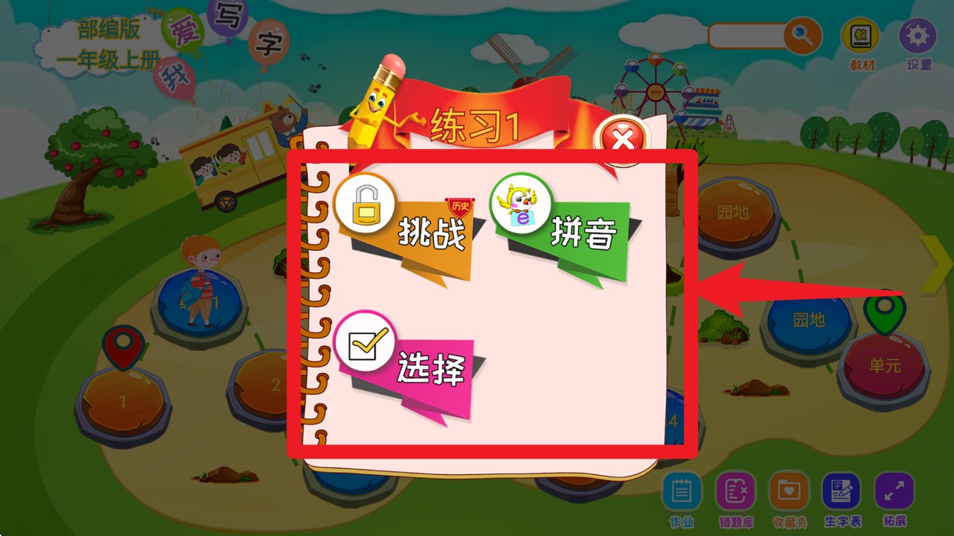 2、在弹出的任务页面中,选择拼音、选择等练习模式,按照图标进入具体的学习内容。