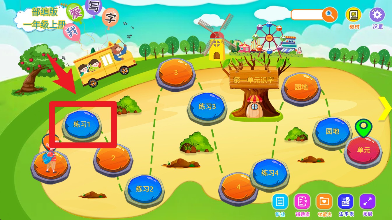 1、进入首页后,选择相应的年级章节,点击练习1等等级按钮,即可进入当前单元的学习任务。