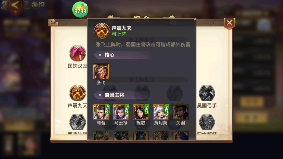 核心英雄:【张飞】张飞上阵时,蜀国主将攻击可造成额外伤害。