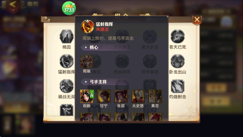 核心英雄:【周瑜】周瑜上阵时,提高弓手攻击。