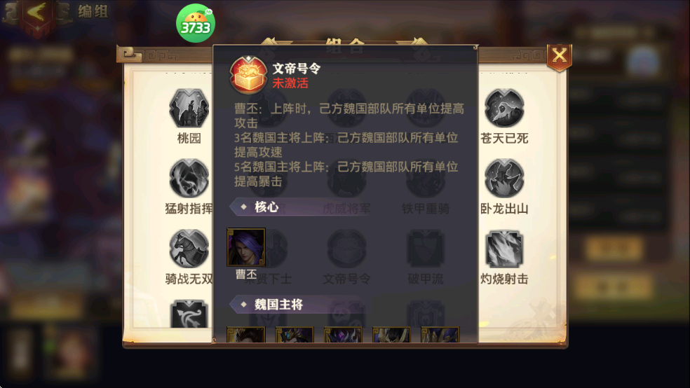 核心英雄:【曹丕】上阵时,己方魏国部队所有单位提高攻击。