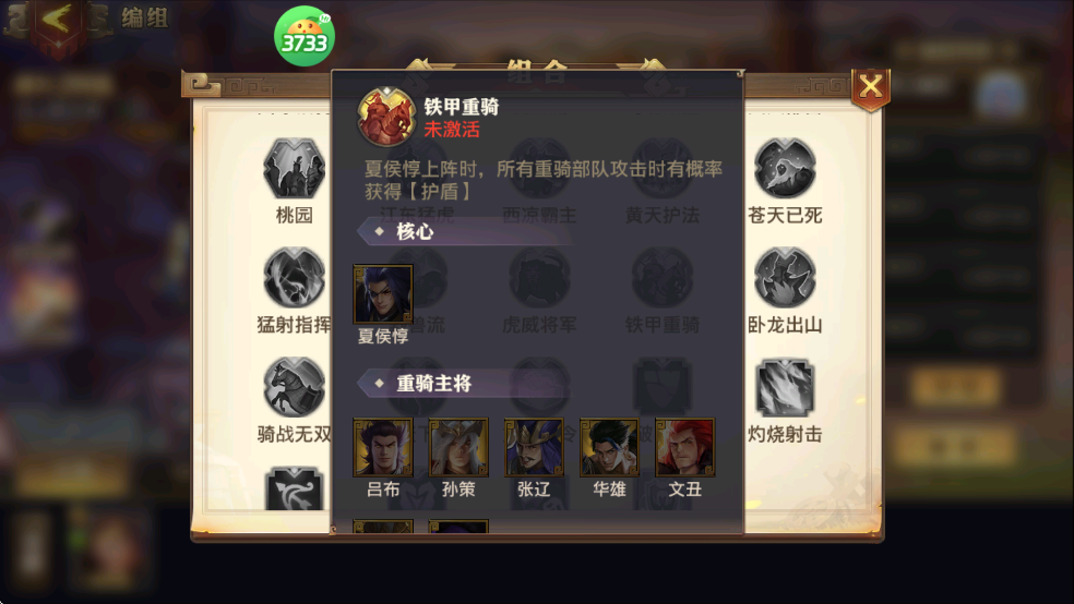 核心英雄:【夏侯惇】夏侯惇上阵时,所有重骑部队攻击时有概率获得护盾。