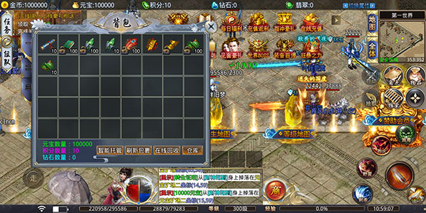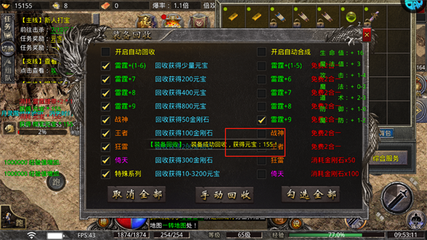 4、随着等级的提升那些打怪多出来的低级装备可以一键回收获得元宝。