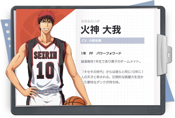 从美国回到日本的他与第一主人公黑子哲也是搭档关系,是与命运之影相遇的真正的光,同时也是诚凛高校的新生王牌。