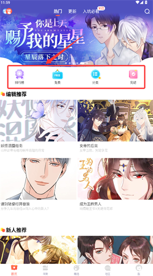2、首页推荐会每天更新热门漫画下拉可以看到分类榜单和编辑精选帮你快速发现感兴趣的作品。