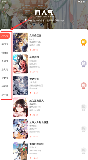 3、进入排行榜可查看月人气、新作榜等多种热门榜单。