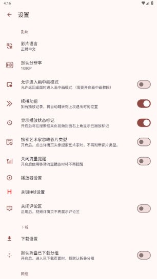 3、在设置页面还可以进行各种细化分的设置,如默认分辨率、下载设置等。