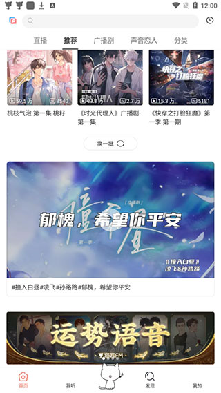 1、打开软件,我们可以看都首页有非常多的收听资源,比如直播、广播剧。