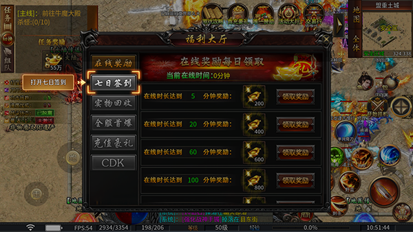 2、然后点击福利大厅里,在这里可以免费领取在线奖励和七日签到奖励。