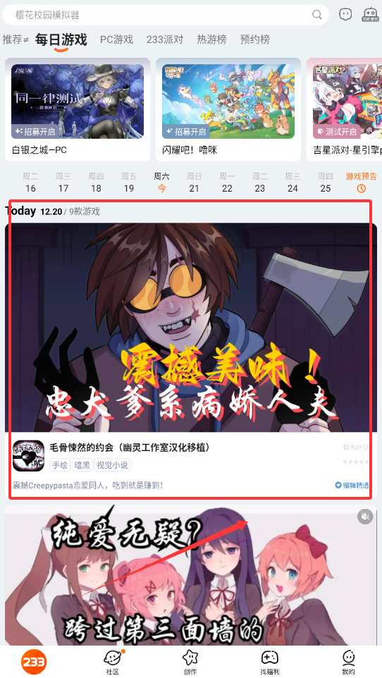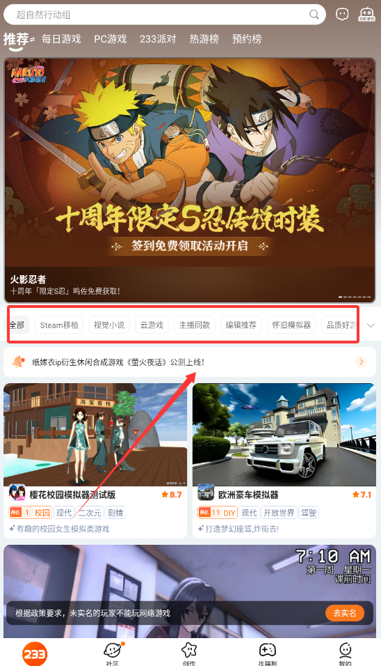 1、在樱花校园模拟器中,你可以通过首页的推荐栏目进入每日游戏或热游榜,浏览最新的游戏测试日程。