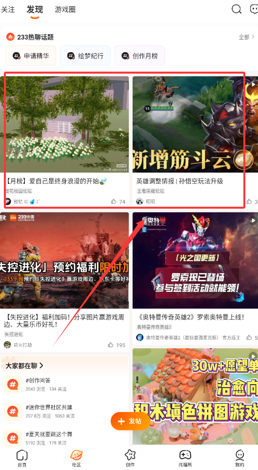 4、在关注发现游戏圈界面,你可以浏览233热聊话题或创作月榜,参与比如爱自己是终身浪漫的开始等讨论,增加互动乐趣。