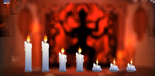 7、窗户上面有蜡烛,根据窗户上面的蜡烛解开神像蜡烛谜题,获得一个半截蜡烛,往右边走,转换场景。