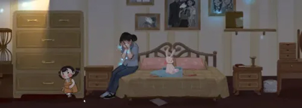 8、从梳妆台爬上去获得兔子,兔子放在中间的礼物盒子,进入上面的空间里。