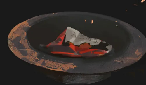 12、把刚刚获得道具全部烧掉,爬上棺材触发剧情,火盆里面有一张纸条,之后进入尾声。