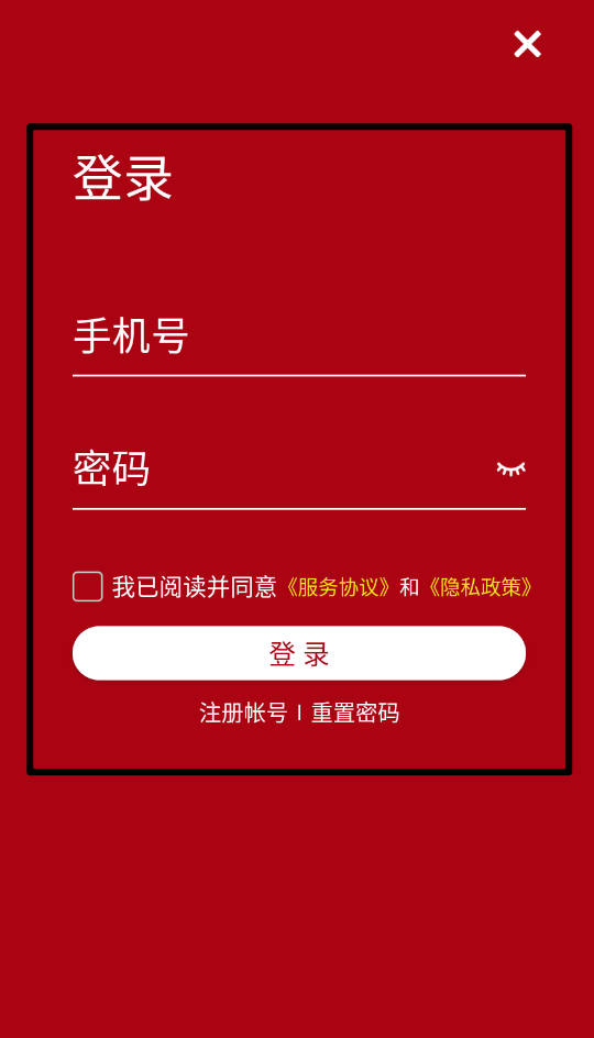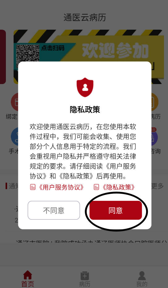 3、在病案界面,您需要填写手机号和密码,同时勾选复选框,同意《服务协议》和《隐私政策》,以确保用户的个人隐私安全。