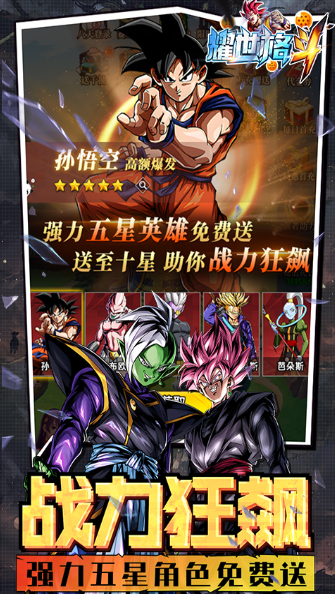 《耀世格斗》是一款由龙珠动漫改编的卡牌战斗游戏。除了《龙珠》和《龙珠Z》中最经典的角色外,游戏还加入了《龙珠GT》、《龙珠超级》和《龙珠超级英雄》等其他世界观的《龙珠》角色。在游戏中,玩家将扮演队长的角色,在龙珠世界中旅行,收集和培养他们最喜欢的英雄团队,体验最经典的龙珠战斗,并在空闲模式下参与自动战斗。通过卡片召唤龙珠角色,与他们并肩作战,体验惊险的战斗!这款游戏还支持玩家在空闲时玩游戏,让玩家可以轻松升级并在没有任何压力的情况下与怪物战斗。