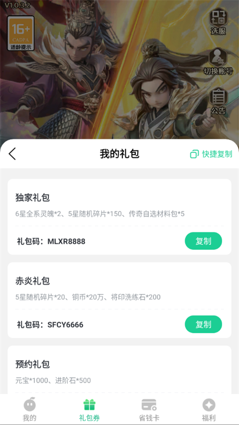 1、进入游戏后,点击首页悬浮球,领取福利礼包兑换码,如下图所示,也可以输入其他的礼包兑换码:QY34QY89WZS、0GDBDJASG、QWHZMSZ。